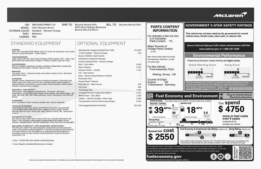 This stunning 2023 McLaren Artura is finished in the iconic McLaren Orange paint and features the official performance update, boosting power to 690 HP/700 PS! A well-maintained example, it has a clean history and was recently serviced by an authorized McLaren dealer in August 2025. An exceptionally-equipped build, highlights include the Technology Pack, Sports Exhaust in stealth finish, electric heated memory comfort seats, and a Bower & Wilkins 12-speaker premium audio system. The two-tone gloss black roof adds a distinctive touch, and complements the gloss black forged wheels. It also has a full car PPF in matte finish.